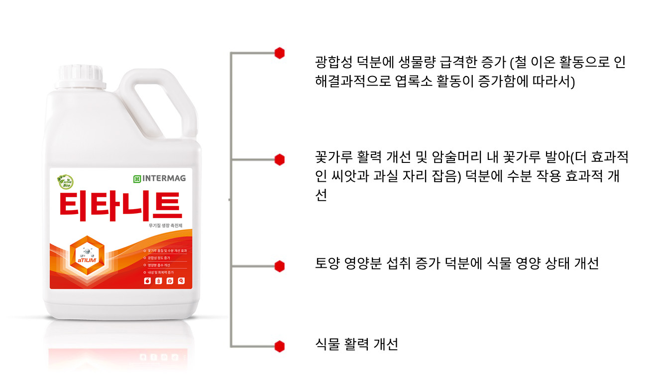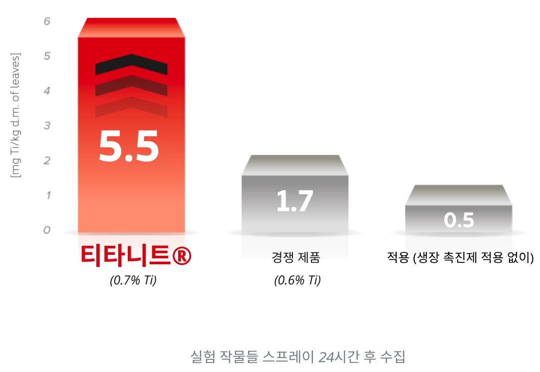 티타늄(Ti)이 식물 내 이로운 요소라는 연구는 20세기 초반 시작되었습니다. 티타늄은 지각 속에 존재하며 토양의 주요 물질이기도 합니다. 하지만, 물 용해성이 없어서 식물에 적용이불가능합니다.